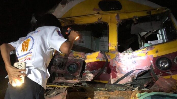 The collision, occurring at 7:34 p.m., resulted in the complete destruction of the train’s front section, while the truck involved overturned, its wheels pointing skyward. Emergency response teams, including volunteer officers from Sawang Chum Saeng, local police, and medical professionals, swiftly descended upon the scene near the Khlong Samphrueng railway barrier in Phan Lan Subdistrict, Chum Saeng District.