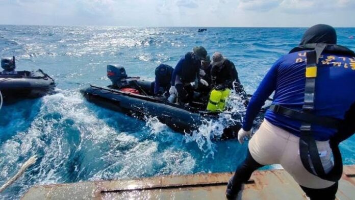 In a collaborative effort between the Thai and US navies, a joint operation was initiated today to locate the remains of five missing crew members from the sunken HTMS Sukhothai corvette. The mission also aims to salvage weaponry and deactivate certain US-manufactured military equipment. Spearheading the operation is the US navy’s “Ocean Valor” ship, hailing from the naval base in Hawaii, accompanied by a flotilla of Royal Thai Navy (RTN) vessels including the Rattanakosin, two mine sweepers, two frigates, and one mid-sized troop carrier. A team comprising 17 American and 40 Thai divers is actively involved in the undertaking.