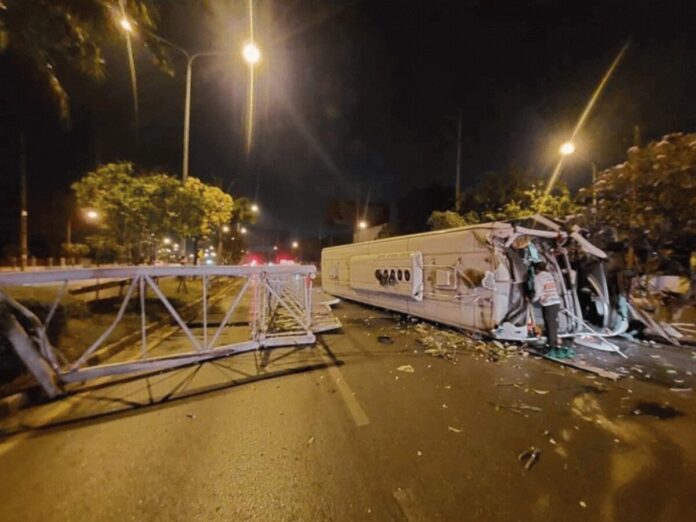 Tragedy struck early Tuesday morning in Muang district, Nakhon Ratchasima, as a long-haul bus operated by Lotusphibul Tours veered off course, colliding with a steel support for a road sign. The grim outcome resulted in the loss of both drivers and left 44 passengers injured, 12 of whom hailed from Laos. The bus, en route from Bueng Kan province to Bangkok, met its unfortunate fate around 2 am, as reported by the Hook 31 rescue foundation.