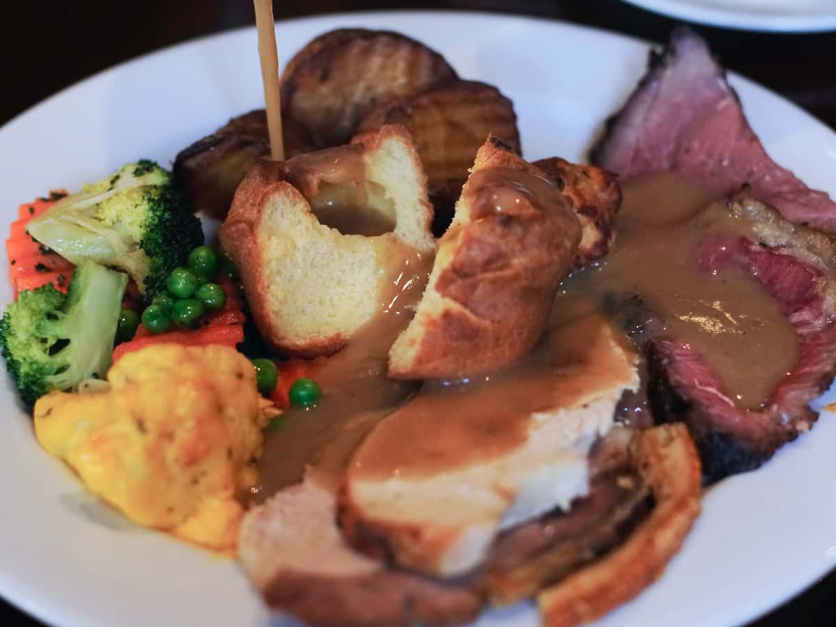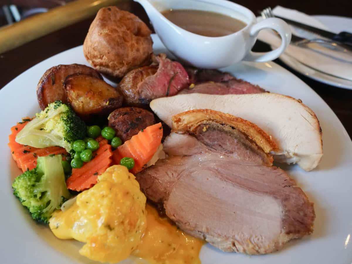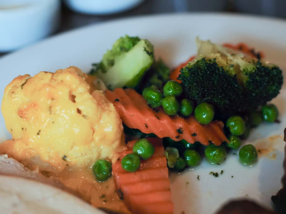 Opting for the mixed plate, we found a satisfying selection of four slices of meat, providing a varied taste experience in line with the traditional British roast. Additional meat, vegetables, or Yorkshire puddings were available upon request, allowing for customization according to personal preferences. Seasonal vegetables, such as carrots, peas, broccoli, and cauliflower cheese, complemented the meal adequately.