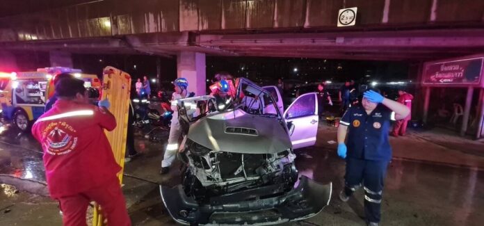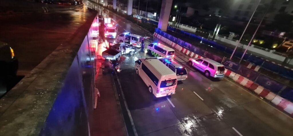 A tragic accident occurred early Thursday morning when a pickup truck lost control and violently crashed into a bridge pillar, resulting in the vehicle being severed in half. The incident happened at approximately 1:30 am opposite the Seacon Square shopping mall on Srinakarin Road inbound, in the Nong Bon Subdistrict of the Prawet District in Bangkok.