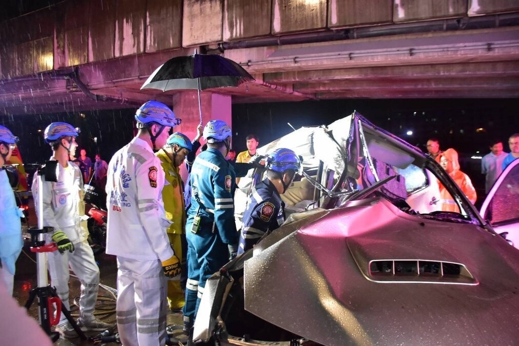 According to a 19-year-old eyewitness, the pickup truck was traveling at high speed in the third lane. The driver attempted to overtake the car ahead and encountered a slow-moving garbage truck, necessitating a sudden brake. The heavy rain and slippery road conditions caused the vehicle to lose control and collide with the bridge pillar. A fire ignited in the engine compartment following the crash, but a quick-thinking bystander used a fire extinguisher to prevent it from spreading.
