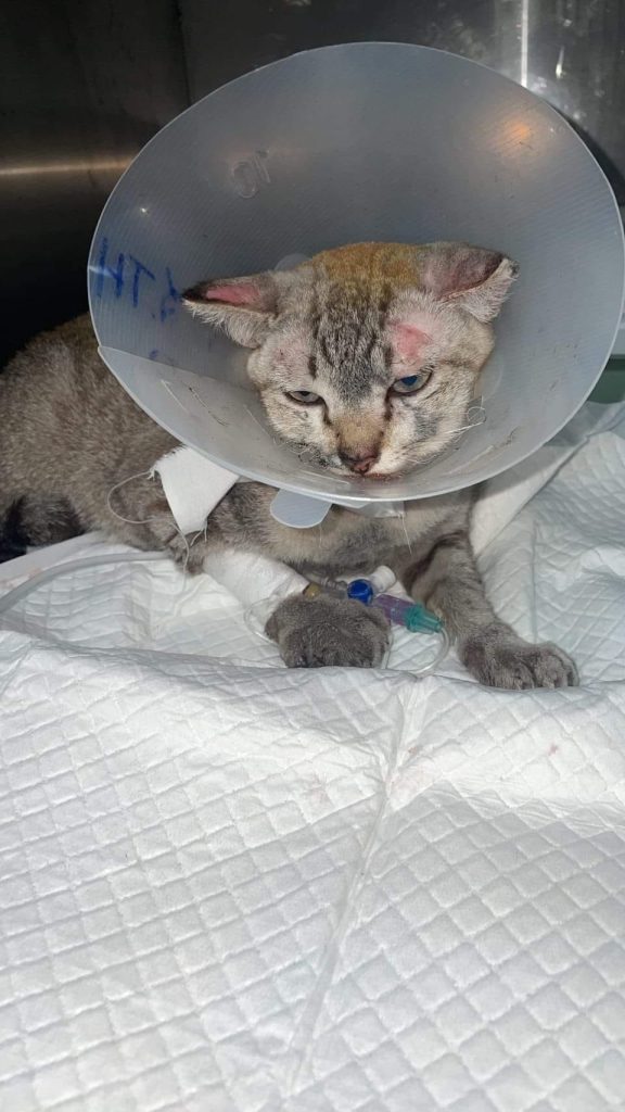 A Facebook user named Clouseau Puttiporn shared an update about a cat that survived the devastating fire at Chatuchak Pet Market. The cat, now under treatment at TH Animal Hospital, was discovered to be pregnant with three kittens, approximately one month into the pregnancy. She sustained burn injuries on her right hind leg, blistered feet, and suffered from smoke inhalation which caused lung issues. The cat is receiving IV fluids for dehydration and is under the care of Dr. Wutthi. The Elephant Nature Park Foundation, led by Saengduean Chailert, oversees her treatment.