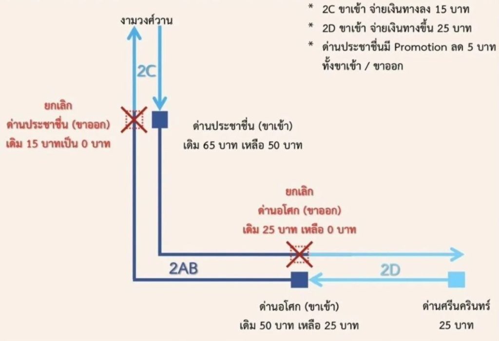 Currently, toll fees along the Ratchadaphisek to Rama 9 route amount to approximately 90 Baht (65 Baht at Phra Khanong and 25 Baht at Asoke interchanges). With the policy revision, these fees are reduced to 50 Baht: 50 Baht, with tolls at Phra Khanong set at 50 Baht (a reduction of 15 Baht) and the removal of tolls at Asoke (previously 25 Baht). Similarly, the Rama 9 to Ratchadaphisek route, originally costing 90 Baht (25 Baht at Srinakarin, 50 Baht at Asoke, and 15 Baht at Phra Khanong), is reduced to 50 Baht. Toll fees at Srinakarin remain unchanged at 25 Baht, while those at Asoke are reduced from 50 Baht to 25 Baht, and the toll at Phra Khanong, previously 15 Baht, is discontinued, resulting in a total reduction of 80 Baht.