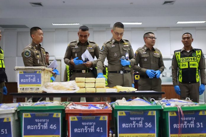 During the search, authorities discovered the drugs concealed in plastic baskets, hidden under a canvas tarpaulin in the truck’s cargo area. The suspects, identified as Amorn Thongchuchuay, 51, and Weerapong Kongkaew, 39, were taken into custody. They admitted to having collected the drugs from Nonthaburi’s Sai Noi district and were en route to deliver them to Nakhon Si Thammarat’s Thung Song district, where the pills were intended to be smuggled out of the country.