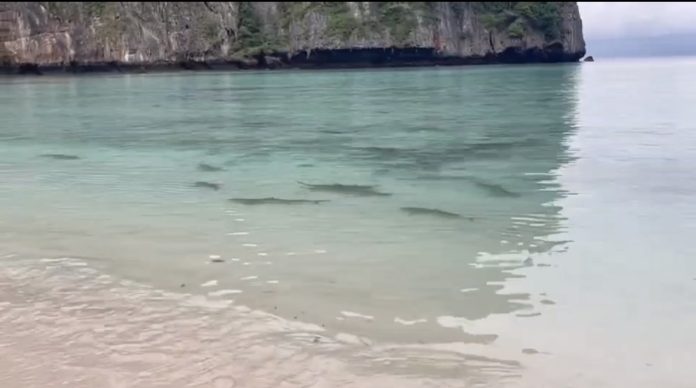 KRABI — Over twenty blacktip reef sharks, including adults and juveniles, were observed feeding at Maya Bay on Sunday, according to officials from Hat Noppharat Thara-Mu Ko Phi Phi National Park. The sighting highlights the thriving shark population in the area.