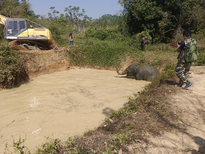 The incident began around 9:00 a.m. when volunteers reported spotting a five-year-old wild elephant that had fallen into a well and was unable to climb out on its own. The site, located in Soi Sue Dao within Ban Ko Lae, Moo 4, Nong Bon Subdistrict, prompted officials from the Khlong Kaew Waterfall National Park and other agencies to mobilize a rescue effort. A backhoe, supplied by a former local official, was deployed to assist in freeing the animal, while villagers were advised to steer clear of the area due to the elephant’s agitated state.